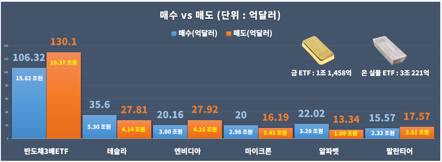 레버리지 상품에서도 거래가 활발했다. 테슬라 2배 레버리지 ETF는 매수 18억4,614만달러, 매도 12억5,389만달러로 총 31억31만달러가 거래됐으며, 나스닥100 3배 레버리지 ETF는 매수 16억225만달러, 매도 12억5,783만달러로 집계됐다. 반도체 하락에 베팅하는 3배 인버스 ETF도 상위 거래 종목에 포함됐다.