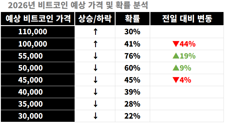 최신 폴리마켓 확률표에서 5만5천달러 하락 확률이 76%로 가장 높게 나타난 점은, 투자자들이 단기 조정 수준을 넘어 추가 하락 가능성을 주요 시나리오로 보고 있음을 시사한다. 5만달러와 4만5천달러 가격대 역시 각각 60%, 45%로 나타나 하방 위험이 여전히 유효하다는 평가다.
