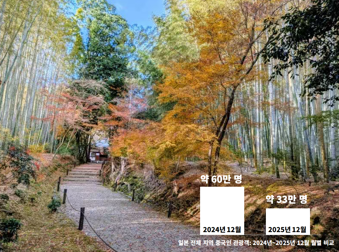 지난 달 일본을 방문한 중국인 관광객 수가 대만 문제를 둘러싼 외교 갈등으로 거의 절반으로 줄어든 것으로 나타났다. 더 가디언 보도에 따르면 일본 교통성은 12월 중국 본토 관광객 수가 전년 동월 대비 약 45% 감소한 33만 명 수준이라고 발표했다.