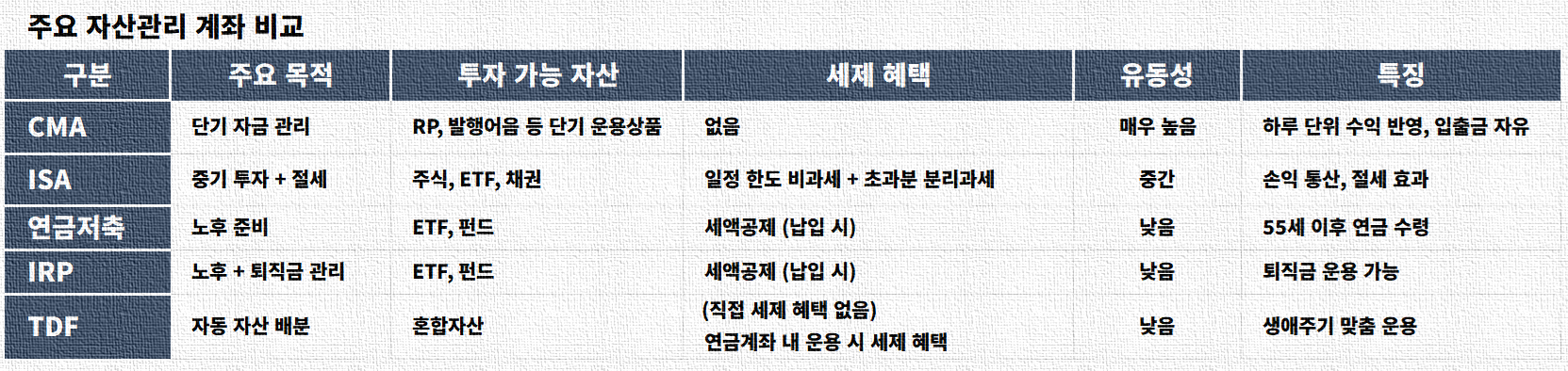 결국 자산 관리의 핵심은 단일 금융상품 중심 접근이 아니라, 현금 흐름과 투자, 노후 대비를 각각 분리해 구조적으로 운영하는 데 있다. 이러한 구조는 장기적인 자산 성장과 세제 효율을 동시에 확보할 수 있는 현실적인 자산 관리 전략으로 평가된다.