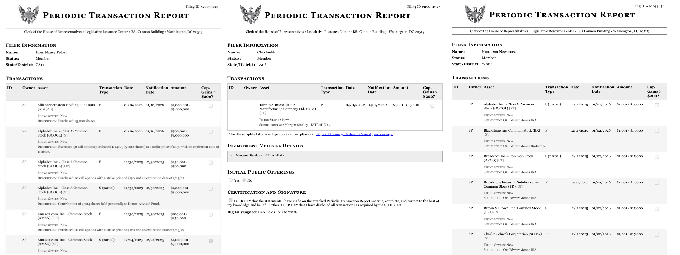 또한 일부 공화당 소속 의원들도 기술주 관련 거래를 진행한 것으로 의회 공시에서 확인된다. 대표적으로 댄 뉴하우스 의원의 경우(1월 15일) 알파벳 등 기술 및 산업 관련 종목에 대해 각각 약 1,001달러에서 15,000달러 규모의 매수·매도 거래가 포함된 것으로 나타났다.