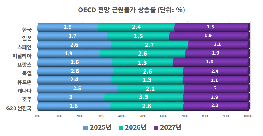 한편 근원물가(core inflation)는 비교적 안정적인 흐름을 유지할 것으로 보인다. G20 선진국 기준으로 2025년 2.6% 수준에서 2026년에도 유사한 수준을 유지한 뒤 2027년 2.3%로 둔화될 전망이다. 유로존과 미국 역시 완만한 변동에 그칠 것으로 예상되며, 한국도 2025년 1.9%에서 2026년 2.4%로 상승 후 점진적으로 안정될 것으로 보인다. 이는 에너지 가격 변동의 영향을 상대적으로 덜 받는 구조적 물가 흐름이 반영된 결과다.