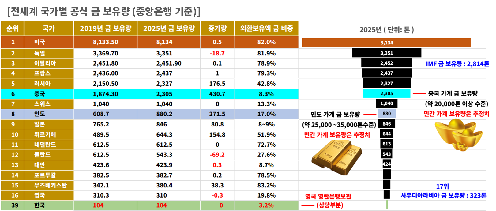 국제 금값 급등과 중앙은행 매입 확대는 단기 투자 수요를 넘어 글로벌 금융 질서와 통화 전략 변화를 보여주는 신호다. 금은 단순한 안전자산을 넘어 국제 금융과 통화 전략의 중심 지표로 부상했다. 실제로 중국과 인도의 민간 가계는 각각 수만 톤(추정 2만~3만5천 톤) 규모의 금을 보유하고 있으며, 이는 금이 단순한 투자 목적을 넘어, 포트폴리오 안정과 시장 방향 예측, 나아가 글로벌 금융·통화 정책 변화와 연계된 중요한 자산임을 보여주는 사례로 해석된다. 이러한 흐름은 개인 투자자들에게도 금값과 글로벌 금융·통화 정책 간 연관성을 이해하고, 장기 투자 전략과 포트폴리오 조정에 참고할 수 있는 시사점을 제공한다.