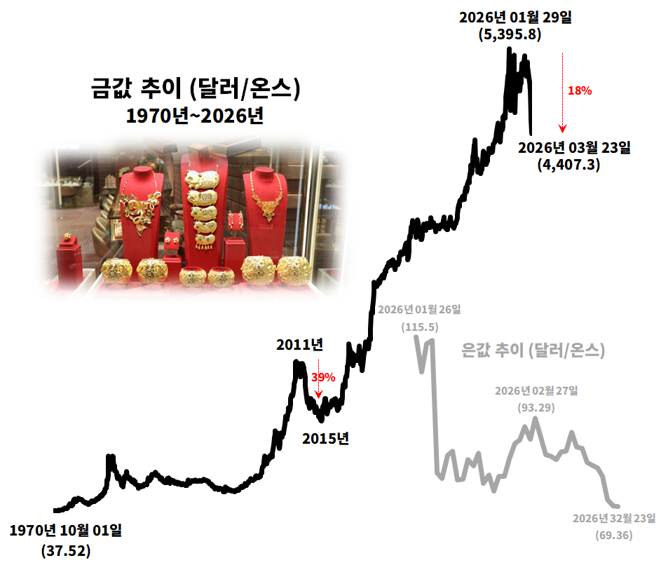 금 가격은 지난 1월 29일 온스당 약 5,395달러로 사상 최고치를 기록한 뒤 하락세로 전환됐다. 이후 3월 초까지 5,300달러 선에서 등락을 반복했으나, 3월 중순 이후 낙폭이 확대되며 4,400달러대까지 급락했다. 현재 금값은 약 4,407달러 수준으로, 고점 대비 약 18% 하락한 상태다.