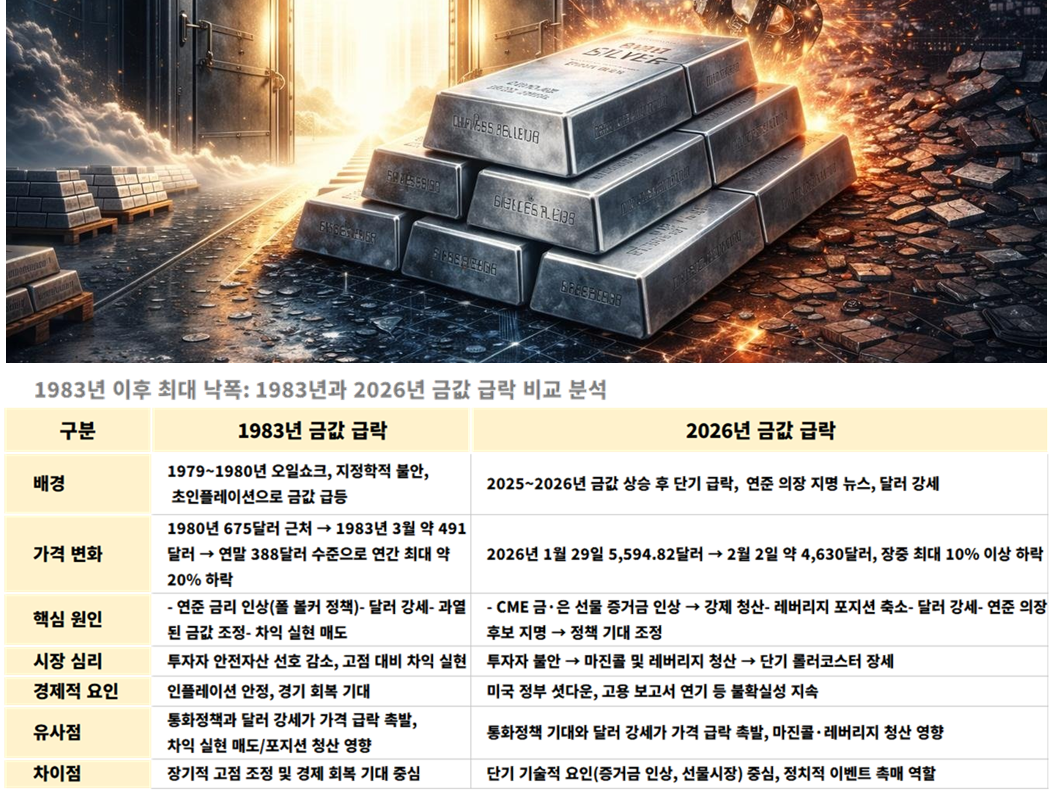 1983년 금값 급락 당시에도 연준의 금리 인상과 달러 강세, 고점 대비 차익 실현 매도가 겹치며 가격이 급락했는데, 이번 2026년 사례 역시 마진콜과 레버리지 청산, 달러 강세가 맞물리며 역사적 낙폭 수준의 변동성을 기록했다. 시장의 관심은 여전히 미국 정부 셧다운, 연기된 고용 보고서, 달러 향방에 쏠려 있다.