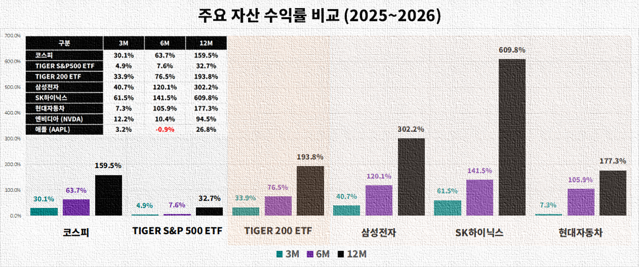 국내 대표 지수형 ETF인 TIGER 200 ETF가 최근 1년간 한국 증시 상승 흐름을 반영하며 높은 수익률을 기록한 것으로 나타났다. 27일 기준 수익률 데이터를 보면 12개월 기준 193.8% 상승했고, 6개월 76.5%, 3개월 33.9%로 중단기 구간에서도 상승 흐름을 이어갔다. 같은 기간 코스피는 159.5% 상승하며 유사한 흐름을 보였다. 반면 TIGER S&P500 ETF는 12개월 기준 32.7% 상승에 그치며 국내 증시와의 격차를 나타냈다.