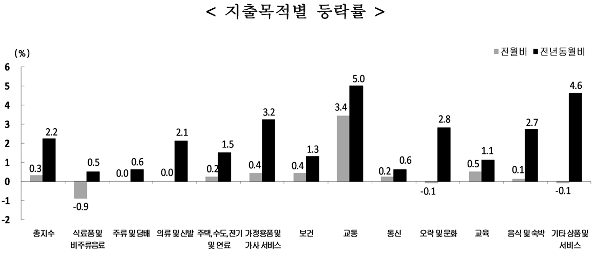 지출 목적별로 보면 전월 대비 교통이 3.4% 상승해 가장 높은 상승률을 보였고, 교육(0.5%), 보건(0.4%), 가정용품·가사서비스(0.4%), 음식·숙박(0.1%) 등도 상승했다. 반면 식료품·비주류 음료는 0.9% 하락했고, 오락·문화와 기타 상품·서비스는 소폭 하락했다. 전년 동월 대비로는 대부분의 항목이 상승한 가운데 교통(5.0%), 기타 상품·서비스(4.6%), 가정용품·가사서비스(3.2%), 오락·문화(2.8%) 등의 상승률이 두드러졌다.