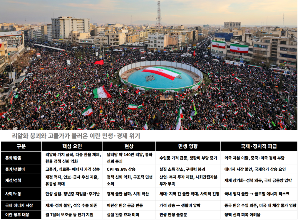 이란 전역으로 확산되고 있는 시위는 특정 정치적 사건이나 구호에서 비롯됐다기보다, 장기간 누적된 경제 불안이 임계점에 도달하며 표면화된 결과로 분석된다. 급격한 환율 하락과 고물가, 정책 왜곡이 중첩되면서 민생 기반이 흔들렸고, 누적된 압력이 사회 전반으로 분출됐다는 평가가 나온다.