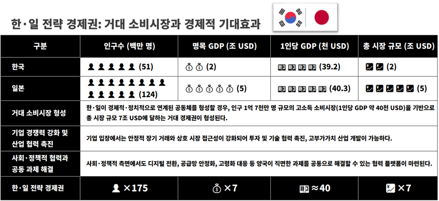 한·일 경제 협의체가 활성화될 경우, 한국 5,100만 명과 일본 1억 2,400만 명, 총 1억 7,500만 명의 인구와 약 7조 달러 규모의 명목 GDP를 기반으로 새로운 공동 생산·소비 시장이 형성될 수 있다. 한국 단독으로는 약 5,100만 명과 2조 달러 규모, 일본 단독으로는 1억 2,400만 명과 5조 달러 규모의 시장이 형성되지만, 양국이 협력하면 단독 대비 시장 규모 격차가 크게 줄어 전략적이고 상호 보완적인 경제 영역이 구축된다. 이 시장 규모는 유럽연합 27개국(인구 4억 4,700만 명, 명목 GDP 17조 달러)과 비교할 때 약 41% 수준으로, 동아시아 내에서 실질적 의미를 지닌 공동 시장 형성 가능성을 보여준다. 지리적 인접성으로 일일 왕복이 가능하며, 단순한 교역 확대를 넘어 양국 기업과 소비자 모두에게 전략적 협력과 상호 시장 접근의 실질적 기회를 제공하는 잠재적 경제권으로 평가된다.