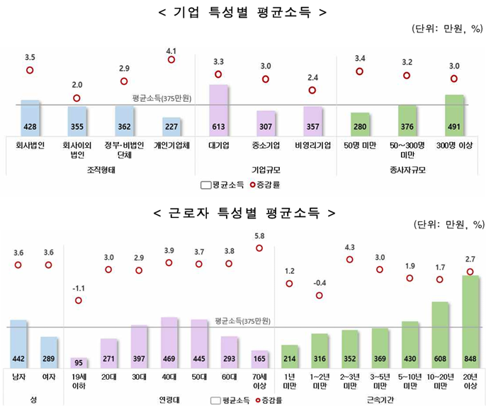 회사법인·대기업 근로자 소득 최고, 개인기업·중소기업 근로자 상대적 저조