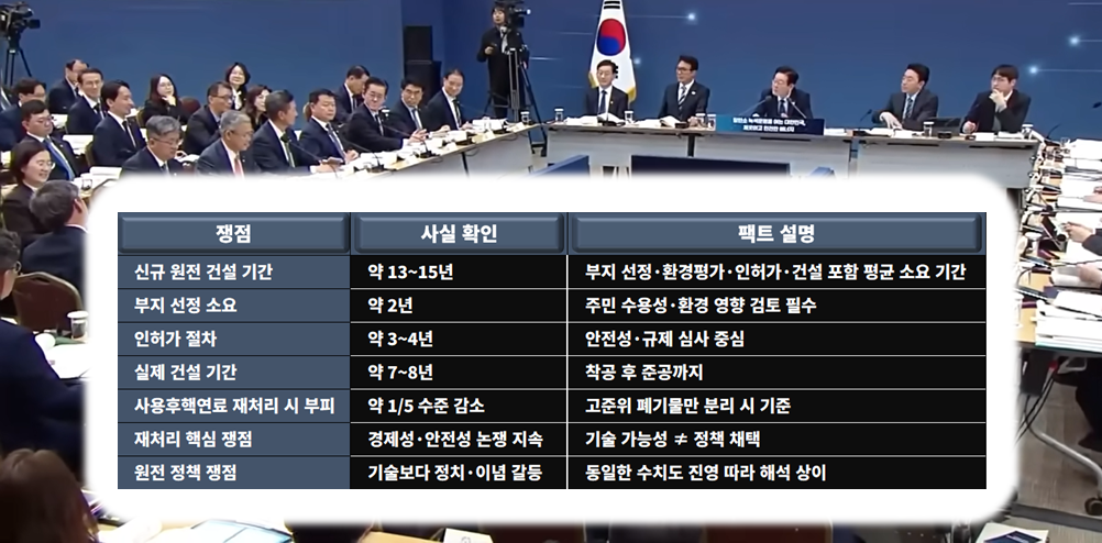 이 대통령은 회의 말미에 “정치 논리를 걷어내고, 있는 사실을 그대로 놓고 치열하게 논쟁해야 한다”며 “원전 정책은 이념의 문제가 아니라 과학과 데이터의 문제”라고 거듭 강조했다.