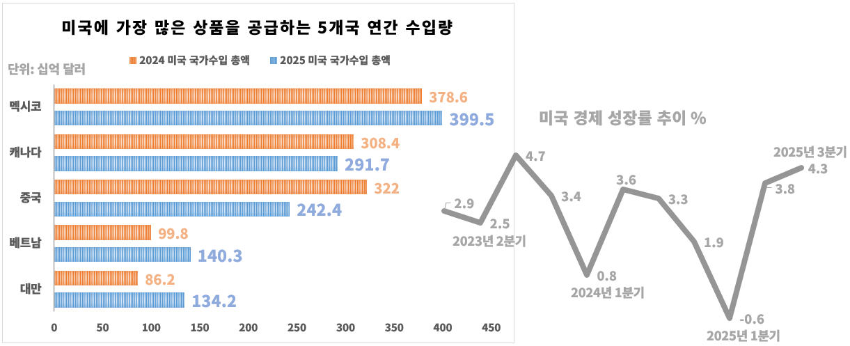 그 결과 올해 1~3분기 동안 중국에서 미국으로 들어오는 상품 가치는 약 25% 감소했다. 반면 멕시코, 베트남, 대만 등에서의 수입은 늘어나며 미국의 수입 구조가 재편되는 양상을 보였다. 이는 관세 정책이 단순한 수입 억제를 넘어 글로벌 공급망의 중심축을 이동시키고 있음을 시사한다.