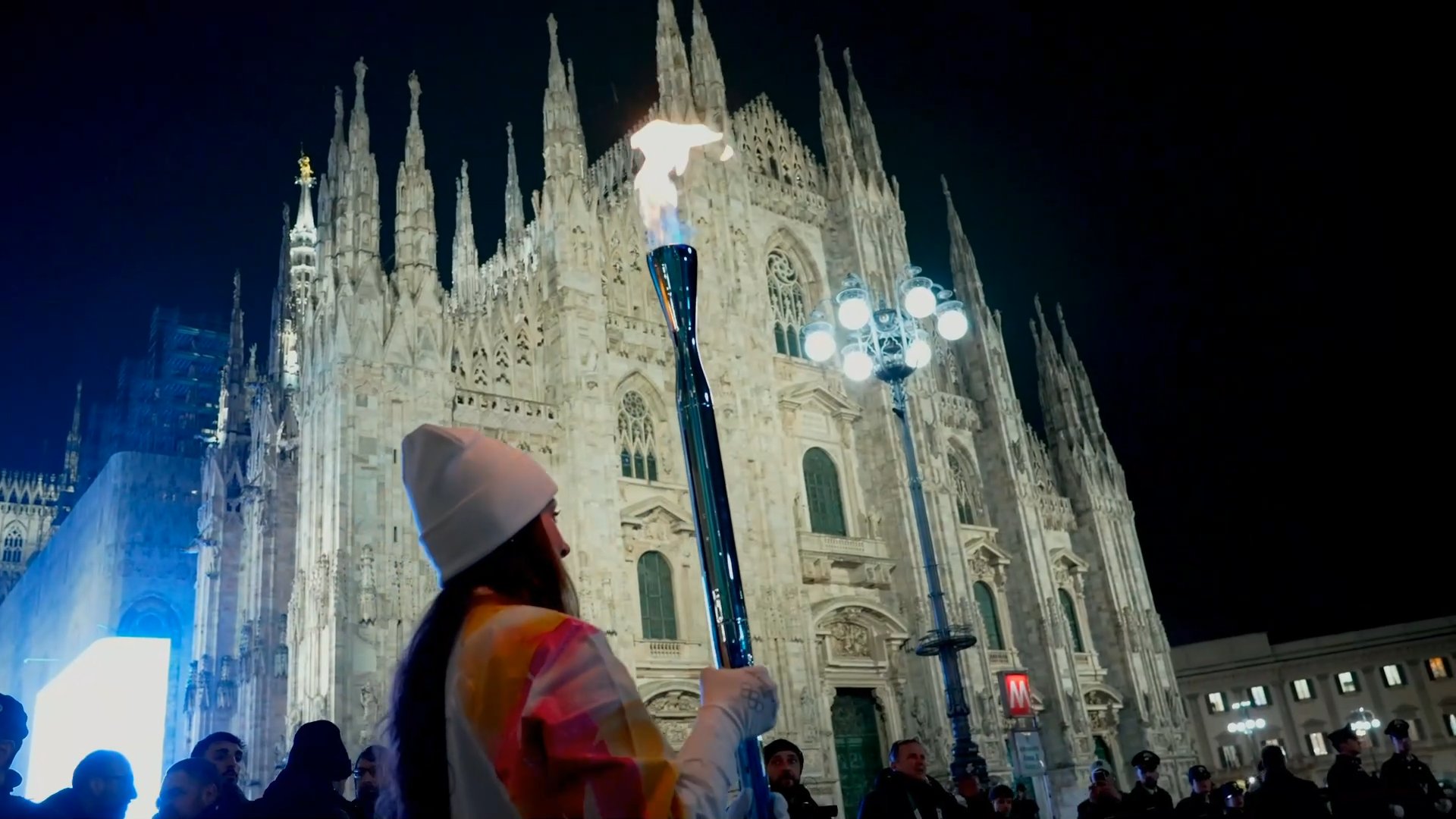 이탈리아 테너 안드레아 보첼리가 푸치니의 ‘투치니 도르마’ 공연을 마친 뒤, 성화 봉송이 산시로에서 4킬로미터 떨어진 평화의 아치로 이어졌다. 이번 올림픽은 전통적 한 곳의 성화대 대신 두 개의 성화대가 설치되었으며, 이는 레오나르도 다빈치의 기하학적 연구를 기리는 의미가 담겼다. 한 성화대는 산시로에, 다른 하나는 코르티나에 위치한다. 성화 점화자는 이탈리아 출신 알파인 스키 올림픽 챔피언 토마바, 데보라 콤파뇨니, 소피아 고지아가 맡았다.