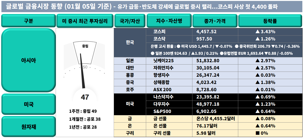 이 같은 글로벌 증시 상승 흐름은 국내 증시에도 그대로 이어졌다. 코스피는 지난 주말 베네수엘라 사태라는 지정학적 불확실성에도 불구하고 대형 반도체주 강세에 힘입어 사상 처음으로 4,400선을 돌파했다. 5일 코스피는 전 거래일보다 147.89포인트(3.43%) 오른 4,457.52로 거래를 마치며 하루 만에 종가 기준 역대 최고치를 다시 썼다. 외국인이 2조원 넘는 대규모 순매수에 나서며 지수 상승을 주도했고, 삼성전자와 SK하이닉스가 사상 최고 시가총액을 기록하는 등 반도체주가 장세를 이끌었다.