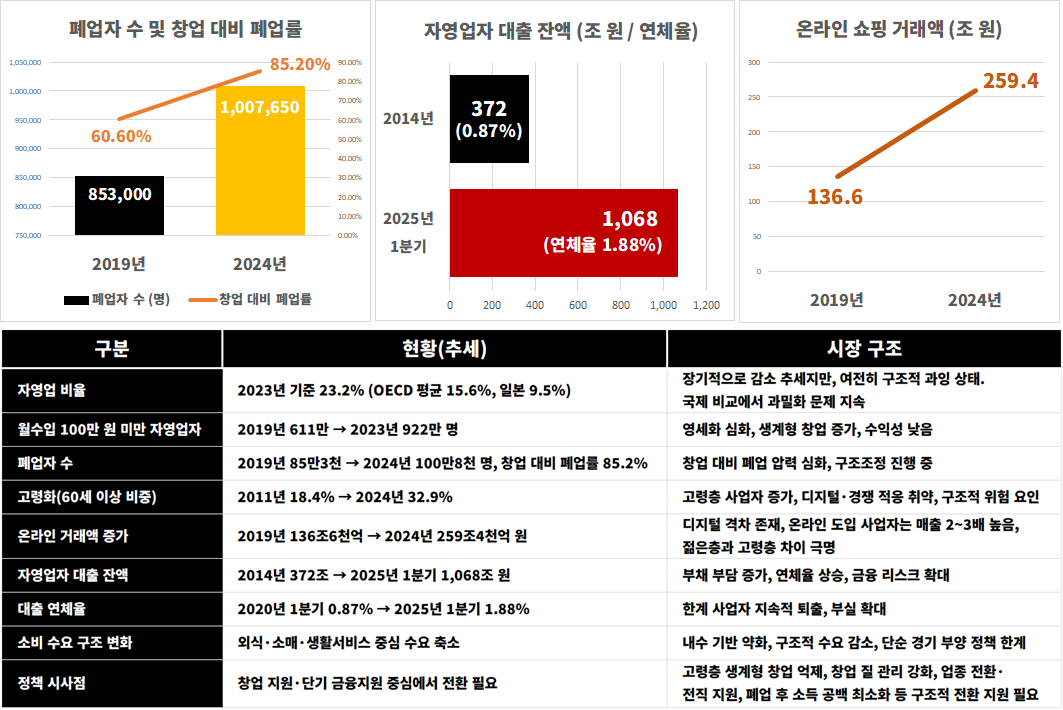 자영업자의 소득 여건은 뚜렷하게 악화됐다. 월수입 100만 원 미만 개인사업자는 2019년 611만 명에서 2023년 922만 명으로 급증했다. 폐업자는 2019년 85만3천 명에서 2024년 국세청 기준 1,007,650명으로 늘었으며, 창업 대비 폐업률은 2020년 60.6%에서 2024년 85.2%까지 치솟았다. 보고서는 코로나19 기간 동안 정부 지원으로 폐업이 일시적으로 억제됐지만, 지원 종료 이후 누적된 구조 문제가 표면화되며 자영업자 시장 퇴출이 가속화됐다고 분석했다.
