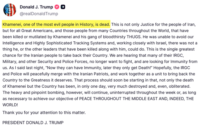 또한, 도널드 트럼프 미국 대통령은 토요일 소셜미디어를 통해 이란 최고지도자 아야톨라 알리 하메네이가 사망했다고 발표했다. 트럼프 대통령은 하메네이의 죽음을 “이란 국민이 나라를 되찾을 수 있는 단 한 번의 가장 큰 기회”라고 표현했다. 이번 사망은 미국과 이스라엘이 공동으로 수행한 공중 폭격으로, 이란의 군사 및 정부 시설을 표적으로 삼은 작전 이후 발생했다.
