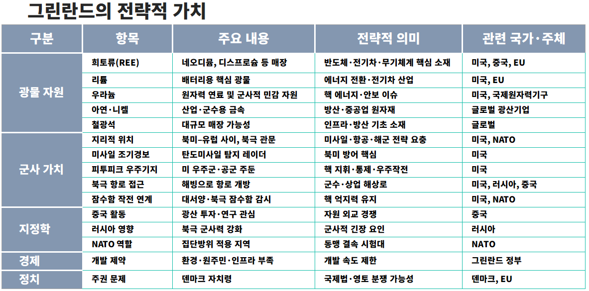 트럼프 행정부는 러시아와 중국의 북극 지역 활동 확대를 그린란드 필요성의 주요 근거로 제시하고 있다. 북극 해빙으로 항로와 광물 자원의 전략적 가치가 커지는 가운데, 그린란드는 미사일 방어 체계와 핵심 자원 확보 측면에서 미국 안보 전략의 핵심 거점으로 부상하고 있다.
