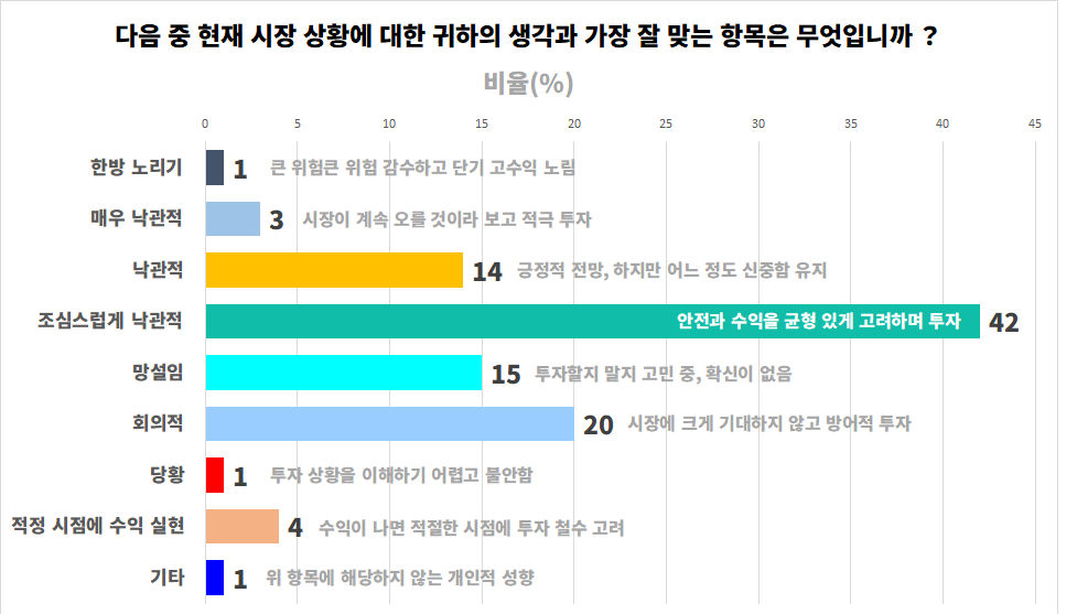 미국 투자자들의 투자 심리는 대부분 조심스럽게 낙관적(42%)인 가운데, 낙관적(14%)과 회의적(20%) 성향도 일정 부분 존재했다. 소수 투자자는 한방 노리기(1%)와 매우 낙관적(3%)으로 공격적인 투자 성향을 보였으며, 망설임(15%), 적정 시점에 수익 실현(4%), 당황(1%) 등 불확실성이나 신중함을 나타내는 심리도 일부 존재했다 / 자료: 인베스토피디아 설문조사, 2026년 1월 31일~2월 2일, 18세 이상 미국 투자자, N=849 / 그래픽: 유스풀피디아