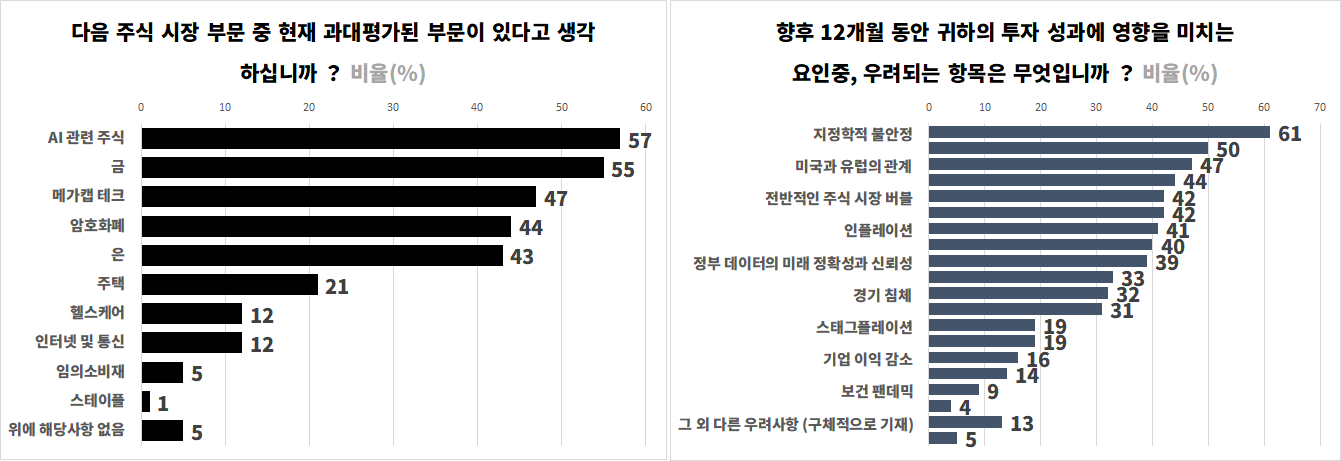 개별 투자자들은 여전히 일부 자산이 거품일 수 있다고 인식하고 있다. AI 관련 주식과 대형 기술주는 과대평가된 자산으로 지목되는 대표적 사례로 꼽혔다. 금 역시 최근 급등세로 인해 거품 자산 목록에서 두 번째로 많이 언급되었다. 최근 금 가격의 급등과 연속적인 최고가 경신은 투자자들에게 안정적인 자산으로 인식되고 있지만, 몇 주간의 가격 변동은 어떠한 자산도 완전히 안정적일 수 없음을 보여주었다.