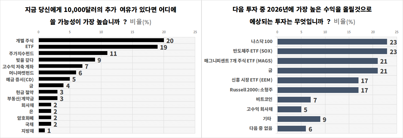 향후 투자 전망에 대한 질문에서도 개별 투자자들은 전통적인 대형 기술주와 나스닥 100, 반도체, ‘매그니피센트 7’으로 불리는 핵심 기술주들이 2026년 최고의 수익률을 낼 것으로 기대한다고 답했다. 금은 그 다음 순위였으며, 비트코인은 최근 장기 약세장 속에서 최하위권 성과 예상 자산으로 나타났다.