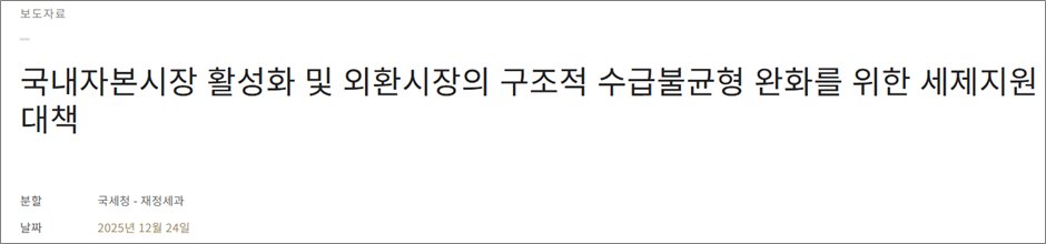 정부는 12월 24일 외환시장 불안과 원화 약세에 대응하기 위해 종합적인 외환 안정 대책을 발표했다. 이번 대책에는 국내 투자 및 외환시장 안정화를 촉진하기 위한 세제 지원 방안(해외주식 양도세 일시 감면, 환헤지 관련 세제 혜택 등)과 함께 외환시장 변동성을 완화하기 위한 제도 개선 조치가 포함됐다. 또한 기획재정부·한국은행 등 관계 당국은 원화의 과도한 약세가 바람직하지 않다는 점을 명확히 밝히고, 국민연금의 전략적 외환 헤지 운용을 보다 유연하게 진행할 수 있도록 복지부와 협의체를 구성해 시장 영향 조율에 나서기로 했다. 정부는 이러한 일련의 조치들이 외환시장에 대한 강한 의지와 실행 능력을 보여주는 것이라고 설명했다.